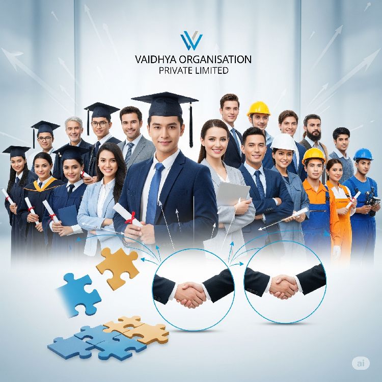 Vaidhya Organisation Private Limited is a premier provider of comprehensive HR solutions, dedicated to connecting businesses with the talent they need to thrive. We specialize in a range of services designed to meet the diverse needs of our clients, from startups to established corporations. Our mission is to empower organizations by providing them with the right people, the right skills, and the right training to achieve their strategic goals.